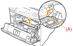 Allineare (A) su entrambi i lati della cartuccia del toner alle apposite guide che si trovano su ambo i lati della macchina, quindi far scorrere la cartuccia del toner nella macchina finché non raggiunge la posizione di riposo agganciandosi alla parte posteriore della macchina.