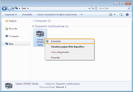 Fare clic con il pulsante destro del mouse sull'icona della macchina e scegliere [Disinstalla] dal menu di scelta rapida.