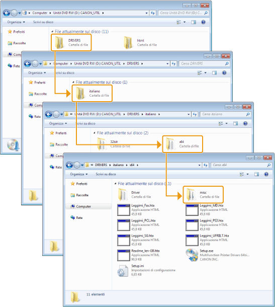 Fare doppio clic sulle cartelle [DRIVERS], [italiano] e [x64] per aprire la cartella [misc].