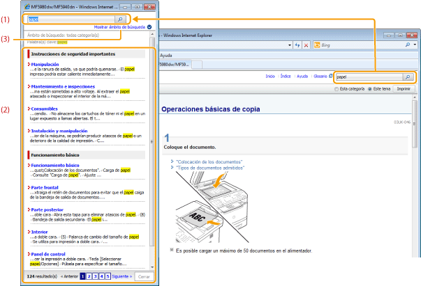 Introduzca una palabra clave en el campo de palabra clave/texto de la esquina superior derecha de la "Página superior" o "Página de temas" y haga clic en [ También podrá introducir su consulta en el cuadro de búsqueda. Adicionalmente, podrá introducirse más de una palabra clave añadiendo un espacio entre ellas. Ejemplo: "Tóner Mensaje" (para ver las páginas que incluyan las palabras "Tóner" y "Mensaje") |