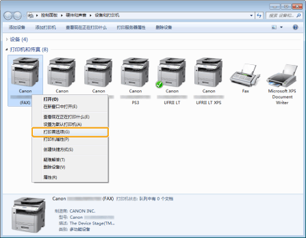 设置] -> [控制面板] -> [设备和打印机]。对于 Windows Vista,单击 [