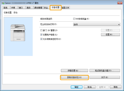 如果通过USB或WSD(设备Web服务)端口连接了打印机和计算机,将无法使用[获取设备状态]功能。需要手动配置这些设置。