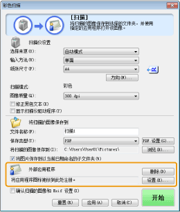 当在 [电子邮件程序] 或 [外部应用程序] 设置中指定了应用程序后,会出现此按钮而非 [保存]。可以将扫描图像转发到此应用程序。