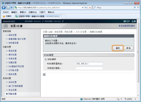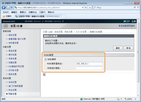 要注册 WINS 服务器上的打印机,您需要设置 [NetBIOS名称] 和 [工作组名称]。要设置 [NetBIOS名称] 和 [工作组名称],请参阅“设置 SMB”。