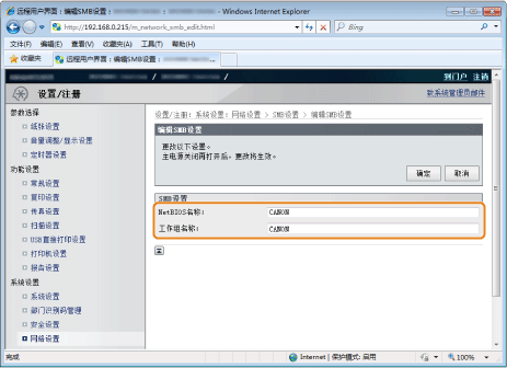 设置 [NetBIOS名称] 和 [工作组名称]