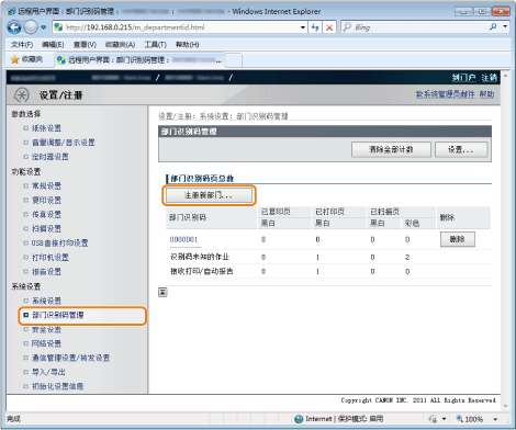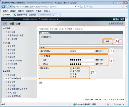![]() 对于不限制该功能的部门,可以选择 <是>,然后输入其部门识别码和 PIN 以使用本产品。