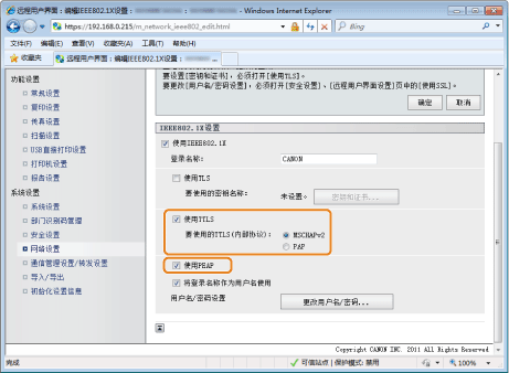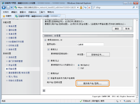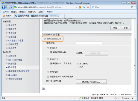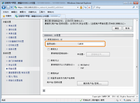 指定 IEEE802.1X 认证期间使用 TTLS 或 PEAP 的认证信息。