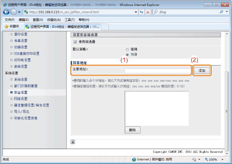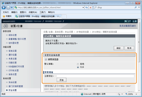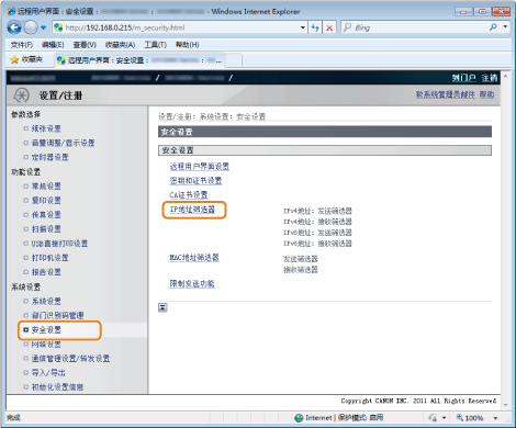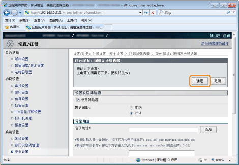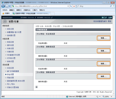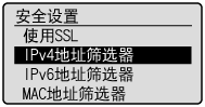 ] 选择 <IPv4地址筛选器> 或 <IPv6地址筛选器>,然后按 [OK]。