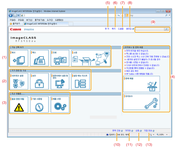 안전 지침, 기기의 특징, 기기 설정 및 효과적인 사용 방법 (예를 들어 용지 올림 및 절전 모드 사용)을 볼 수 있도록 선택한 내용으로 연결합니다. |