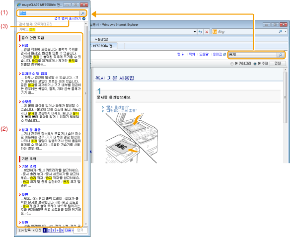 '상위' 또는 '항목 페이지'의 오른쪽 상단 모서리에 있는 검색어/문자 입력칸에 검색어를 입력한 후 [ 검색창에 검색어를 입력할 수 있습니다. 또한 검색어 사이에 빈 칸을 추가하여 하나 이상의 검색어를 입력할 수 있습니다. 예: '토너 메시지'('토너' 및 '메시지'를 포함하는 페이지를 표시하려는 경우) |