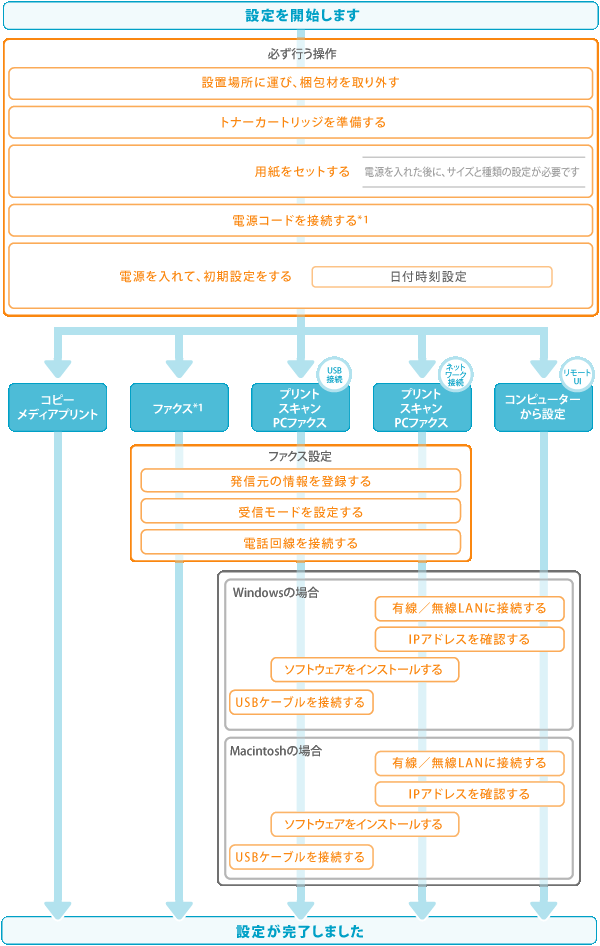 各機能(コピー、プリント、ファクス、PCファクス、スキャン、リモートUI、メディアプリント)を使用するには、以下の流れに沿って設定してください。