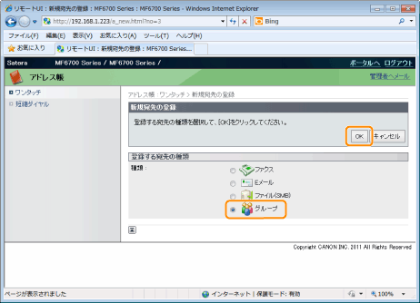 ][ ]で宛先を追加するグループダイヤルを選択して、[OK]を押します。![]() |
