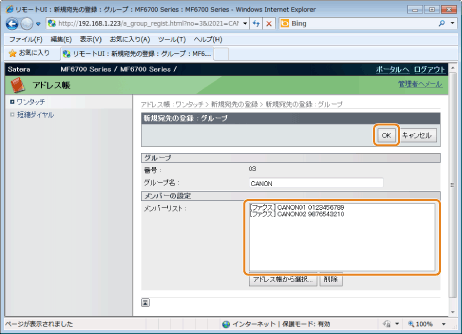 [メンバーリスト]に登録した宛先が表示されていることを確認し、[OK]をクリックします。