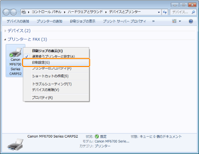 ](スタート)→[コントロールパネル]→[プリンタ]をクリックしてください。Windows XP/Server 2003の場合は、[スタート]→[プリンタとFAX](または[スタート]→[コントロールパネル]→[プリンタとその他のハードウェア]→[プリンタとFAX])をクリックしてください。