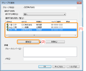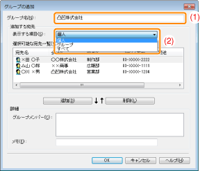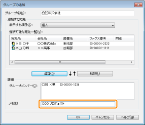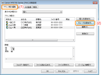 すでに登録されたグループの宛先の情報を編集することもできます。詳しくは、ファクスドライバー画面の右下の[ヘルプ]をクリックして、ヘルプを参照してください。