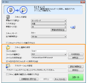 [スキャン画像]ダイアログボックスに読み込んだ画像が表示されます。以下の項目を参照して、ファイルの種類と保存先を指定してください。