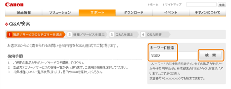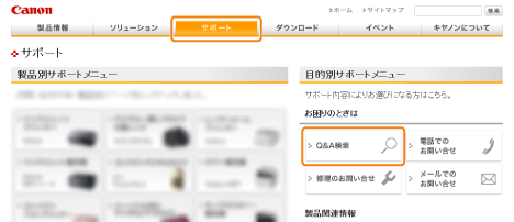 「サポート」を選択して、「目的別サポートメニュー」の「Q&A 検索」をクリックします。