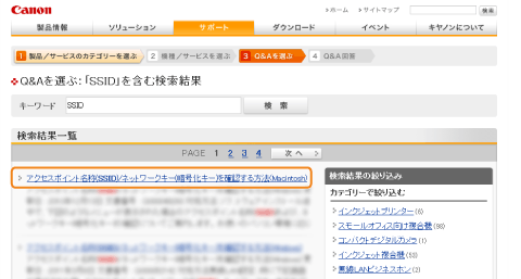 「検索結果一覧」の”アクセスポイント名称(SSID)/ネットワークキー(暗号化キー)を確認する方法(Macintosh)”をクリックします。