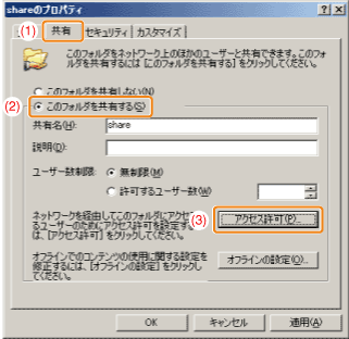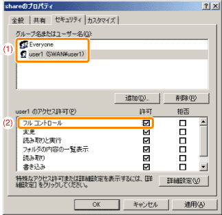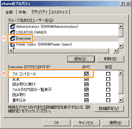 [許可]の[フルコントロール]にチェックマークを付けます。