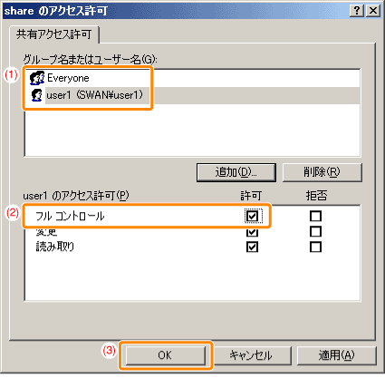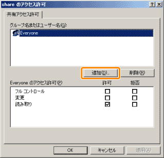 本製品でスキャンしたデータをコンピュータ(ファイルサーバー)に保存できるようにするため、ここでは[フルコントロール]にチェックマークを付けてください。
