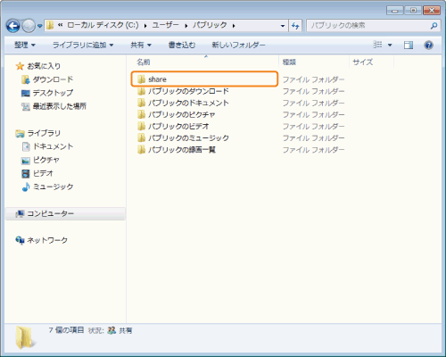 [コンピューター]内の階層を開いて、[パブリック]フォルダーをクリックします。