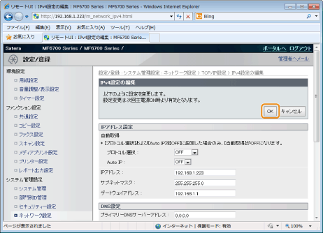 DHCPオプション設定を変更した場合は、本製品を再起動します。