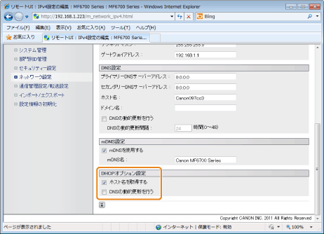 DHCPサーバーからホスト名を取得するときにチェックマークを付けます。