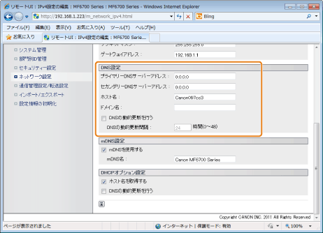 DNSの動的更新機能を使用して、[ホスト名]と[ドメイン名]を設定することで、本製品のIPアドレスを固定しなくても使用できるようになります。
