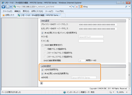 [IPv4と同じmDNS名を使用する]にチェックマークを付けなかった場合に入力します。