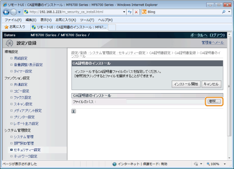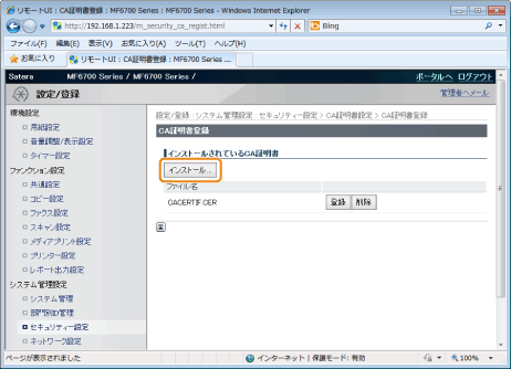 コンピューターに保存されている鍵と証明書(PKCS#12形式)やCA証明書(X.509形式)を本製品にインストールします。工場出荷時にはCA証明書が1件プリインストールされています。