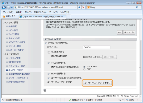 IEEE802.1X認証でTTLSまたはPEAPを利用するための認証情報を設定します。