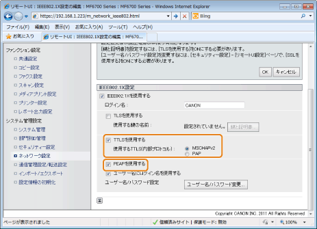 [TTLSを使用する]または[PEAPを使用する]にチェックマークを付けます。