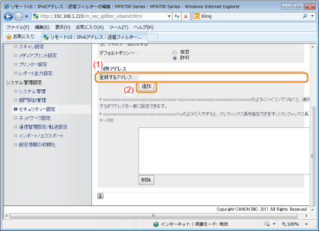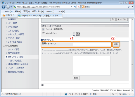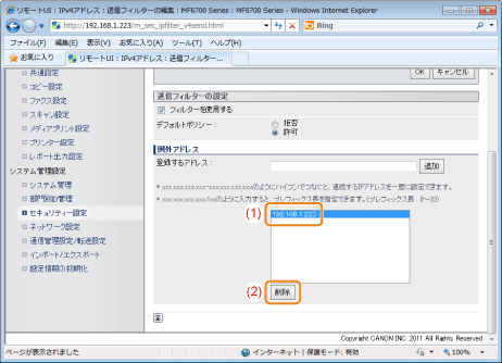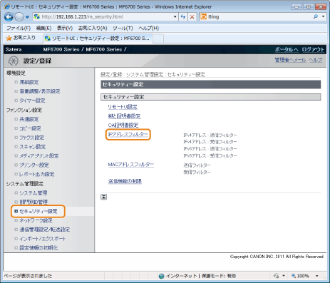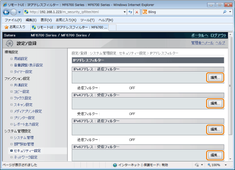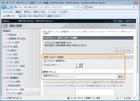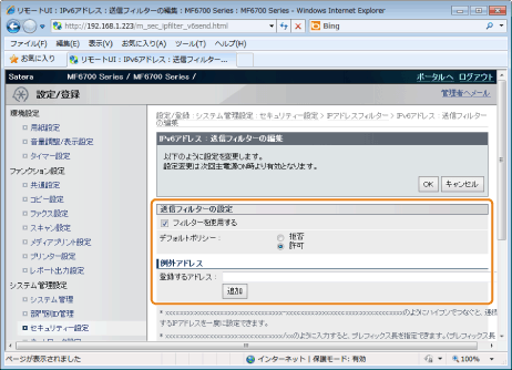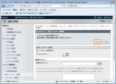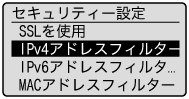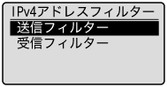 ]で<IPv4アドレスフィルター>または<IPv6アドレスフィルター>を選択して、[OK]を押します。