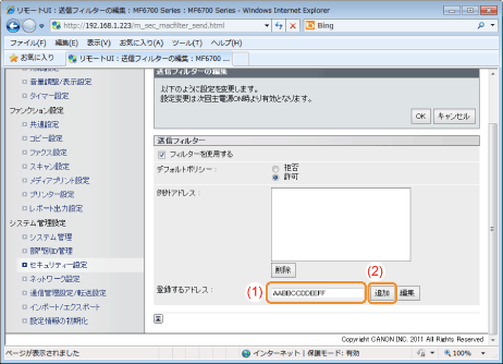 [許可]の[例外アドレス]に設定されているMACアドレス