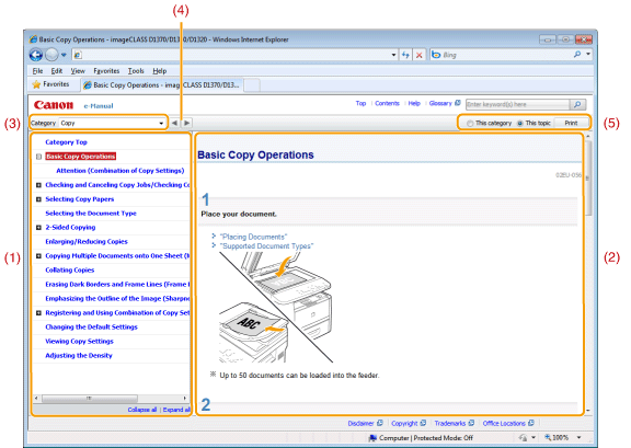 Display the contents of the selected category. Click the content that you want to view in the left column. The entire section is displayed in the right column (topic page). Click [