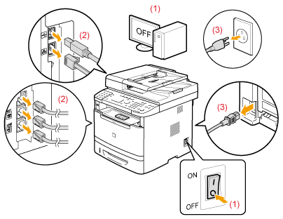 If these items are dropped or spilled inside the machine, immediately turn OFF the power switches of the machine and computer (1) and disconnect the interface cable if it is connected (2). Then, unplug the power plug from the AC power outlet (3) and contact your local authorized Canon dealer. ![]() |