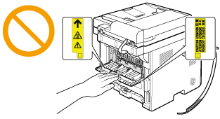When removing jammed paper or when inspecting the inside of the machine, do not expose yourself to the heat emitted from the fixing unit and its surroundings for a prolonged period of time. Doing so may result in low temperature burns, even though you did not touch the fixing unit and its surroundings directly, as this may result in burns.