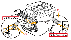 Fit the protrusions (A) on both sides of the toner cartridge into the guides located on both sides of the machine and slide the toner cartridge into the machine until the toner cartridge comes to rest and is held against the back of the machine.
