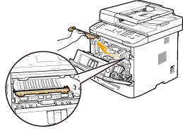 Place the toner cartridge on a flat surface, lift the tab, and gently pull the sealing tape completely out. The full length of the sealing tape is approximately 20" (50 cm).