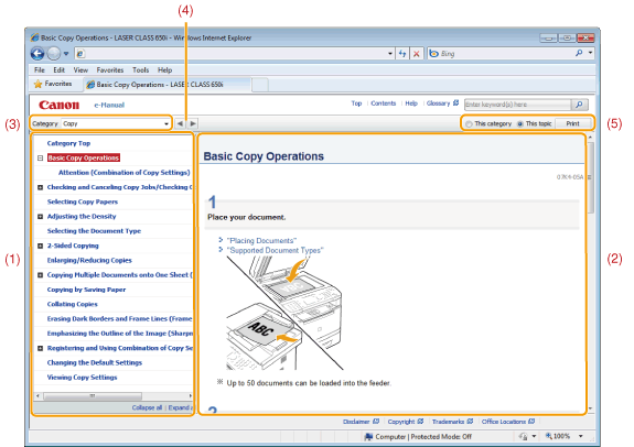 Display the contents of the selected category. Click the content that you want to view in the left column. The entire section is displayed in the right column (topic page). Click [