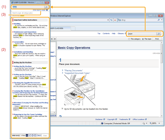 Enter a keyword in the keyword/text field located on the upper right hand corner of the "Top" or "Topic page", and click [ You can also enter your query in the search box. Additionally, more than one keyword can be entered by adding space in between. Example: "Toner Message" (to display pages which include words, "Toner" and "Message") |