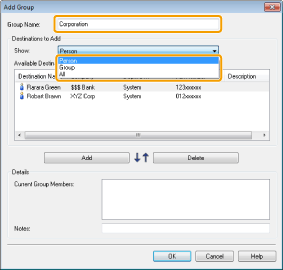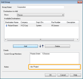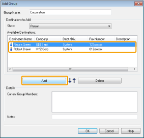 You can also edit previously registered group destination information. For more information, click [Help] in the bottom right-hand corner of the fax driver window to view the online help.