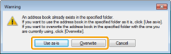 If an address book already exists in the folder selected in Step 2, the following message box will be displayed. If you want to use the existing address book, click [Use as-is], and if you want to use the address book of the fax driver, click [Overwrite].
