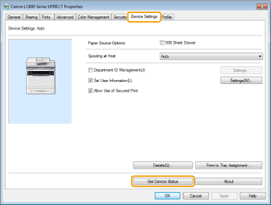 If the printer and computer are connected via USB or a WSD (Web Services on Devices) port, the [Get Device Status] function is unavailable. You need to configure the settings manually.