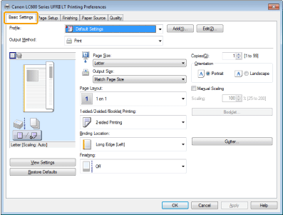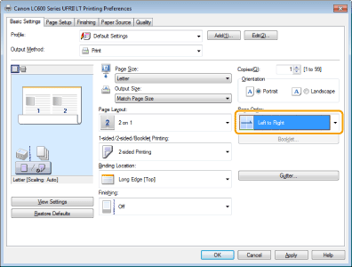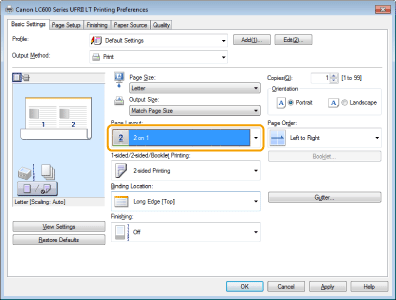 If you cannot select the options for [Page Layout], display the [Device Settings] tab, and then select [Auto] or [Enabled] from [Spooling at Host]. For instructions on how to display the [Device Settings] tab, see "Setting the Printer Options."