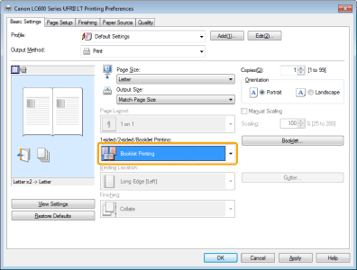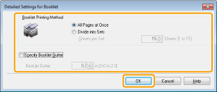 For details about the various settings in the [Detailed Settings for Booklet] dialog box, view the online help. (See "Viewing the Online Help.")