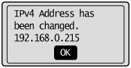 To restart the machine when <Auto Obtain> is set to <On> for the IP address settingsThe IP Address may change with displaying the following screen. When this occurs, configure printer settings on your computer using this option. Otherwise, you may not be able to print to the machine from it.