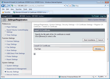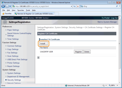 [Security Settings] -> Click [Key and Certificate Settings] or [CA Certificate Settings].