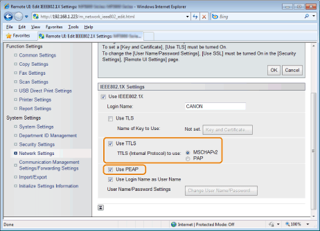 Select either the [Use TTLS] or the [Use PEAP] check box.