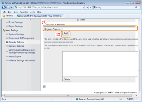 Add a slash after [Prefix Address] and put [Prefix Length] after the slash to specify an IPv6 address prefix.